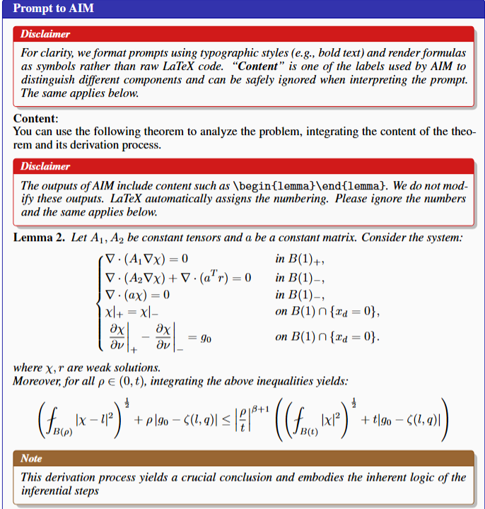 2.理论协同应用(Theory-Coordinated Application):将某一数学分支的完整理论体系(定义、引理、推理规则)打包为“知识包”提供给AIM,使其在预设理论框架内开展多步骤连贯推导。在证明“Cell Problem”的正则性时,人类专家提供了“Schauder Theory”的全套核心引理,AIM据此逐步推导,最终得出符合预期的结论,展现出对复杂理论体系的应用能力。