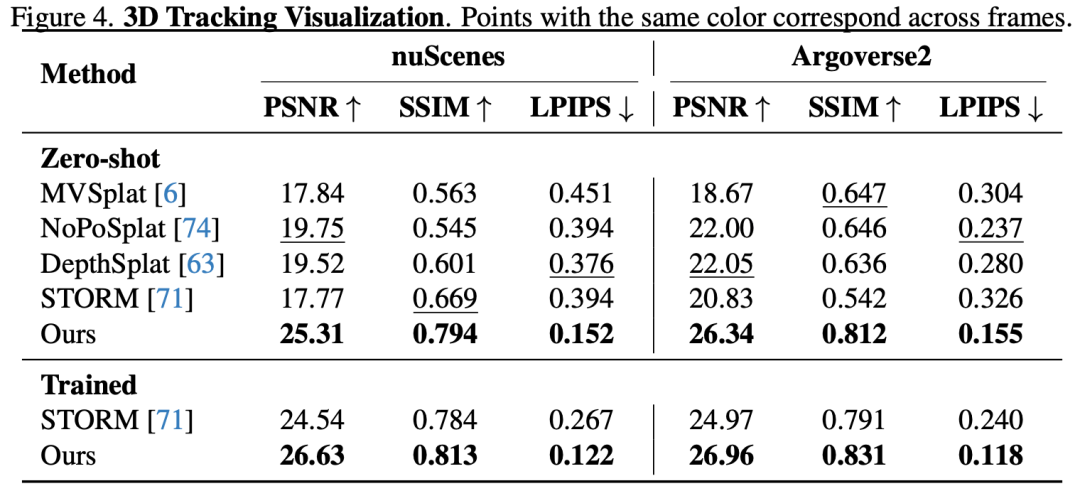 : 仅在 Waymo 训练,无需在目标数据集上微调即可在 nuScenes 与 Argoverse2 上获得优于SOTA的定量与定性结果(LPIPS 降幅 52%–61%)。