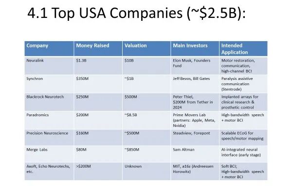 梳理公开信息可以发现,美国的AI巨头押注 BCI 与基因工程,Neuralink融资约 13 亿美元,估值在数十亿美元量级,主要出资人就是 Elon Musk;Synchron的早期投资者包括 Jeff Bezos、Bill Gates;Blackrock Neurotech的早期天使投资人包括 Peter Thiel;Sam Altman 也以个人身份投入了新的 BCI 创业公司(如 Merge Labs 等)。他们背后的共同逻辑是:想让人类活得更长、活得更好、活得更舒服;同时,在下一场技术革命中抢占平台级入口与数据源的制高点。