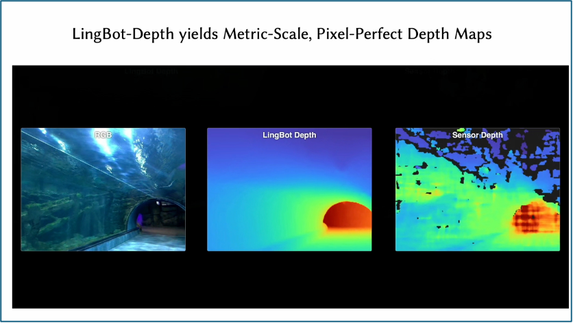 下图展示了Lingbot-Depth在海底观赏通道场景下的测试结果,对于透明、反光等物体,Lingbot-Depth都能输出高质量深度图,显著优于Sensor Depth。
