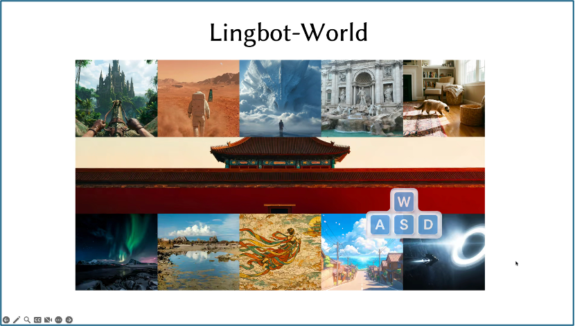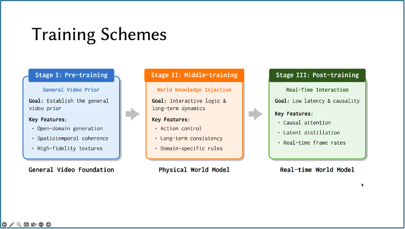 Lingbot-World包含了视频生成模型训练的几个关键阶段:第一阶段聚焦开放域泛化和纹理逼真度,徐英豪博士特别提到直接生成一分钟视频的self-forcing方法本质存在缺陷,因此才在Wan等基础模型上再次注入General Video Prior;第二阶段重点是通过middle training注入world knowledge和long-term dynamics,尤其是不同物理场景下交互逻辑的差异性。他提到目前的Infra框架已支持长视频训练,从技术路径来看,团队正在尝试突破现有14B模型在复杂运动处理和文本联想方面的局限性。最后是Post-training,实现最终的用户级部署。