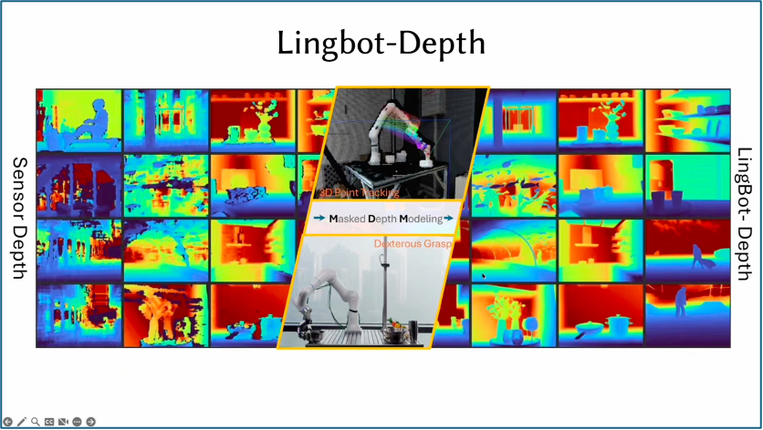 徐英豪博士首先介绍感知方面的进展,重点讨论深度估计作为物理场景理解的基础,并以LingBot-Depth 为例进行说明,同时介绍一种由深度引导的 LingBot-VLA,它利用几何线索来提升视觉-语言-动作之间的对齐效果。随后,他将介绍视频世界建模作为一种模拟机制,使机器人能够捕捉环境动态,并从视觉观测中想象合理的近期未来状态,这一点以 LingBot-World 为代表。