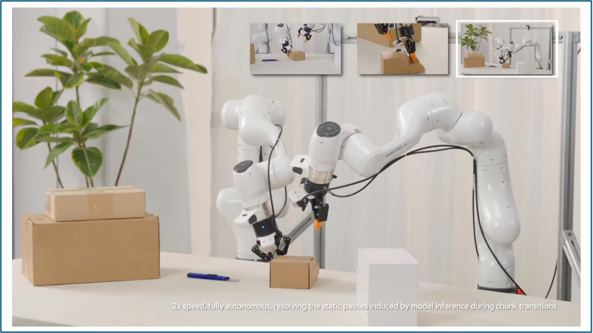 在高难度的真机评测中,徐英豪博士提出了异步机制的重要性,即“边想边做“”边做边想“,他认为人类思维本身就是异步的,异步推理方案更接近自然行为模式。虽然未使用算子加速,但异步方案已能大幅度解决问题。硬件方案固然是可行的,但是团队更倾向于算法研究型方向。在下图的真机测试中,机械臂完成了高精度的双臂操作任务,成功操作手工刀切开了快递盒。