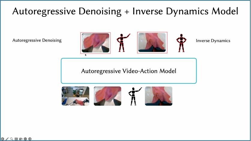 当前神经模拟领域正从物理基础模拟转向生成式神经网络模型,如今大多数world model已具备优秀的动态理解能力,他比较质疑用其生成下游数据再训练VLA模型的合理性,认为这相当于用教师模型去迁就学生模型。在Lingbot-VA工作中,团队采用了自回归生成video结合IDM来逆向提取Action模型的思路,即”Video-Action Policy”。