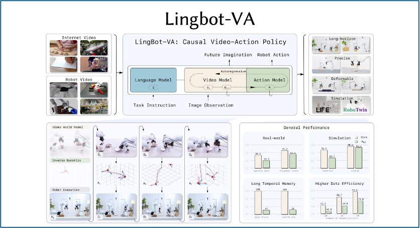 为此,团队提出了"Video-Action Policy"的创新思路。徐博士对利用世界模型生成下游数据再训练VLA的传统做法表示质疑,认为这如同“用教师模型迁就学生模型” 。Lingbot-VA转而采用自回归(Autoregressive)范式结合逆动力学模型(IDM),通过高频的“预测-执行”循环,有效解决了传统开环控制中状态与动作不匹配导致的系统崩溃问题 。