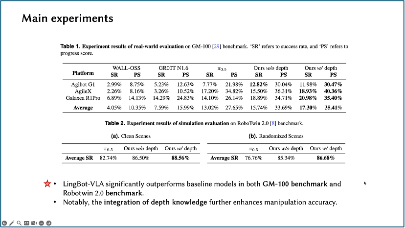 在Lingbot-VLA的实验讲解中,徐博士强调了对模型进行全面评估的重要性,他提到当前实验规模庞大且资源消耗惊人——目前约已完成2万多组实验,涉及高昂的金钱和时间成本。他特别提到深度信息(depth)的加入显著提升了模型性能,但同时也暴露出任务难度极高,整体成功率仅17%。