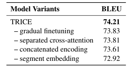 我们将提出的面向多源序列生成的任务无关框架命名为TRICE(a task-agnostic Transferring fRamework for multI-sourCe sEquence generation),其在WMT17 自动后编辑任务以及WMT14 多源端翻译任务上取得了新的最佳结果,在文档翻译任务上也显著超过了基线系统。